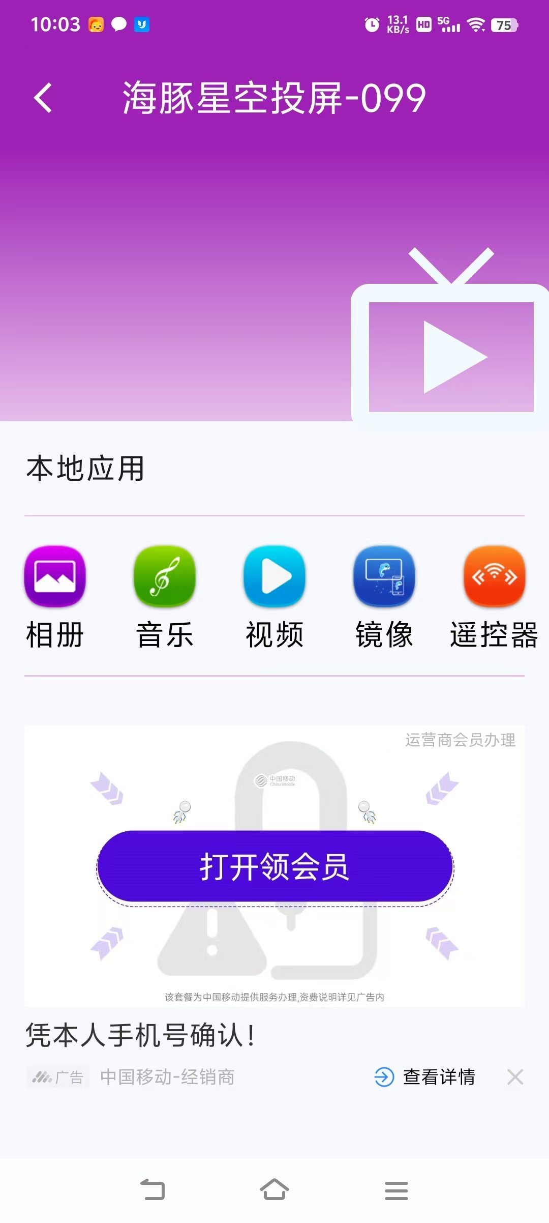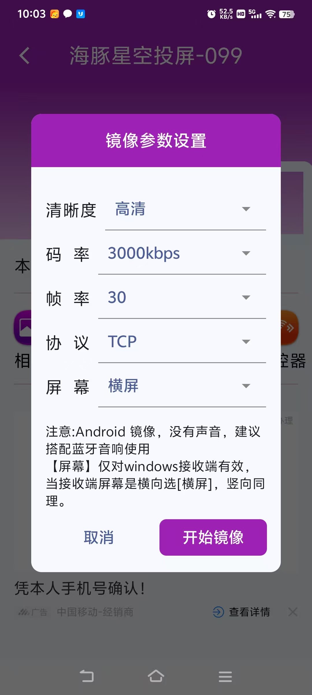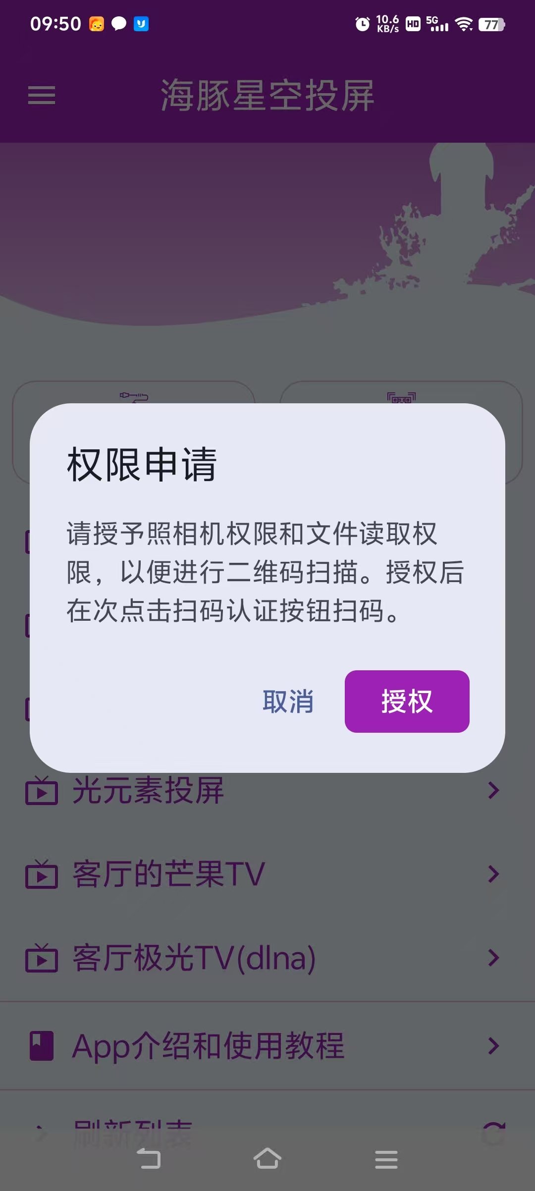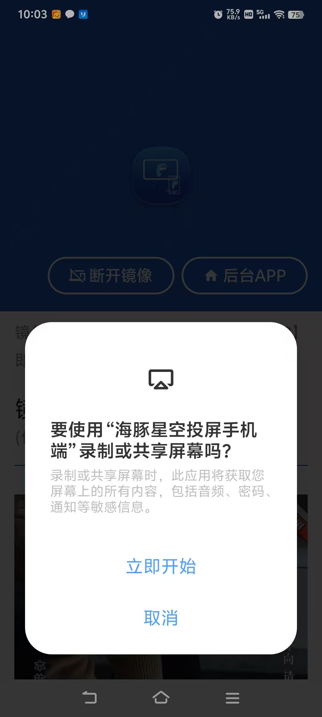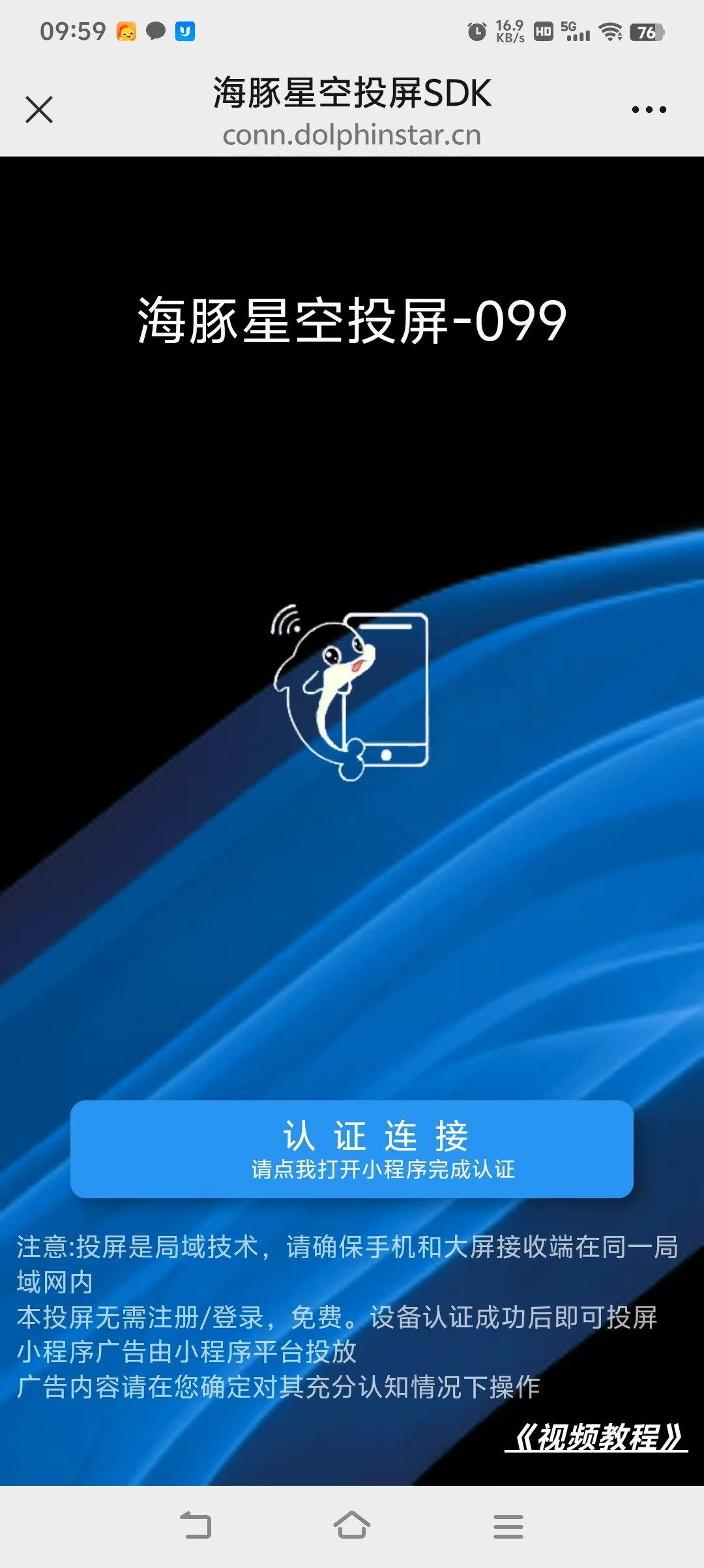 先下载手机投屏软件:https://file.dolphinstar.cn/android/海豚星空投屏app.apk 安装